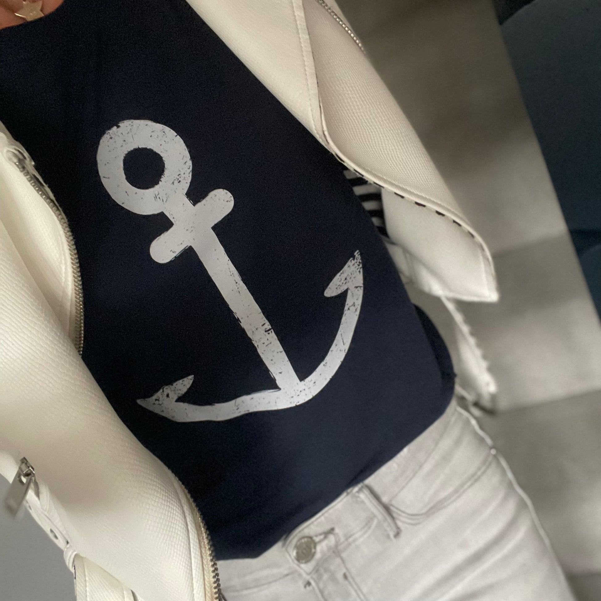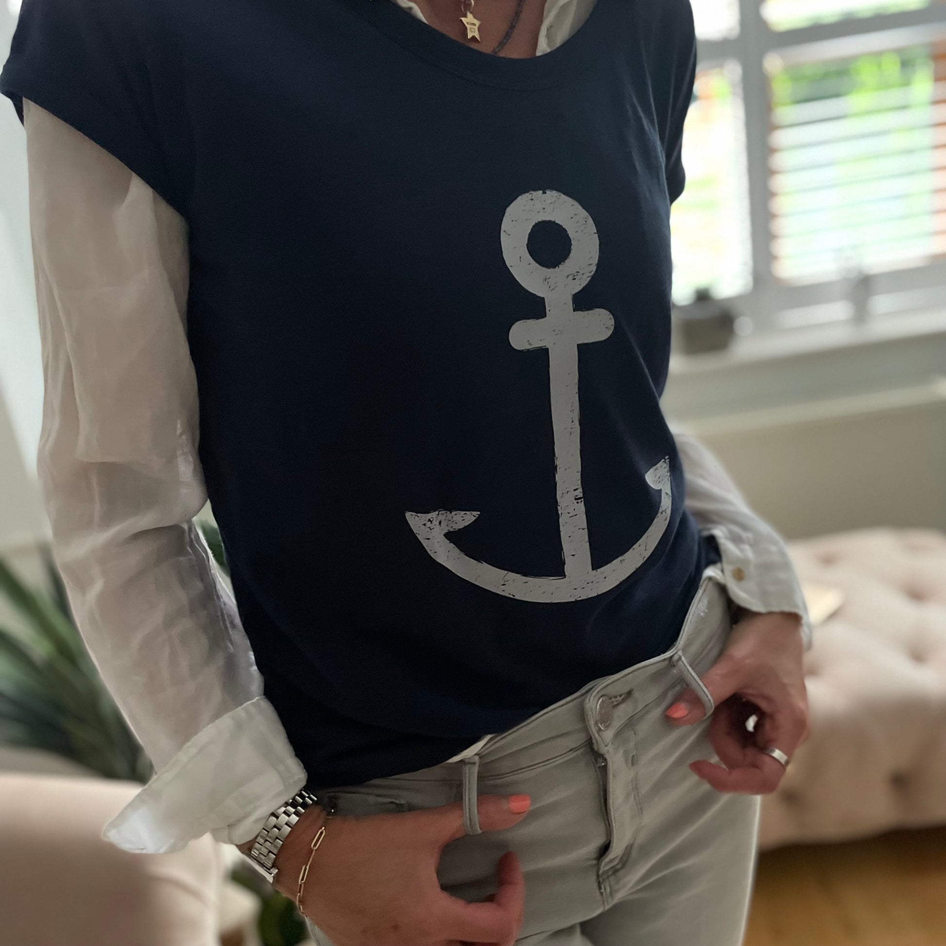 French Navy Tee has a soft grey distressed Anchor print which will match with our jewellery perfectly.